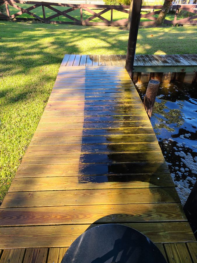 This wooden deck and dock in Niceville, FL had so much mold/mildew build up that it was very slippery and unsafe to walk on. When cleaning wooden surfaces we take a 2 step approach and thoroughly soap the areas for 5-10 minutes before pressure washing. This allows us to use much less pressure and preserve the longetivity of the wooden surface. Using our 4 nozzle surface cleaner doesn't cause any wood to fray or splinter but still cleans the surface. Impeccable Pressure Washing has expert training on washing decks and docks.